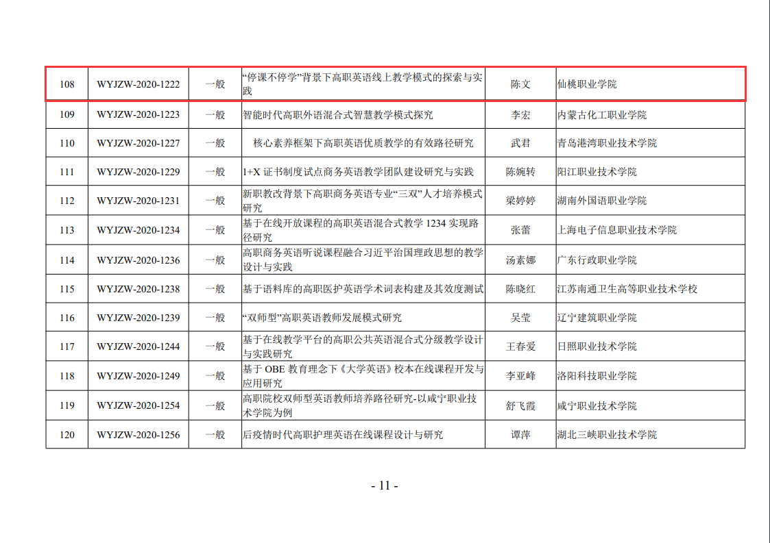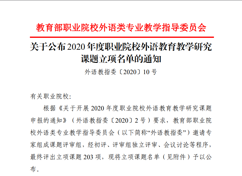 近日,从教育部职业院校外语类专业教学指导委员会下发的《关于公布2020年度职业院校外语教育教学研究课题立项名单的通知》中获悉,我院教师魏淑娟申报的“高职英语精品在线开放课程的建设探究与实践——以《大学英语(进阶)》在线课程为例”及陈文申报的““停课不停学”背景下高职英语线上教学模式的探索与实践”成功立项为2020年度职业院校外语教育教学研究课题。