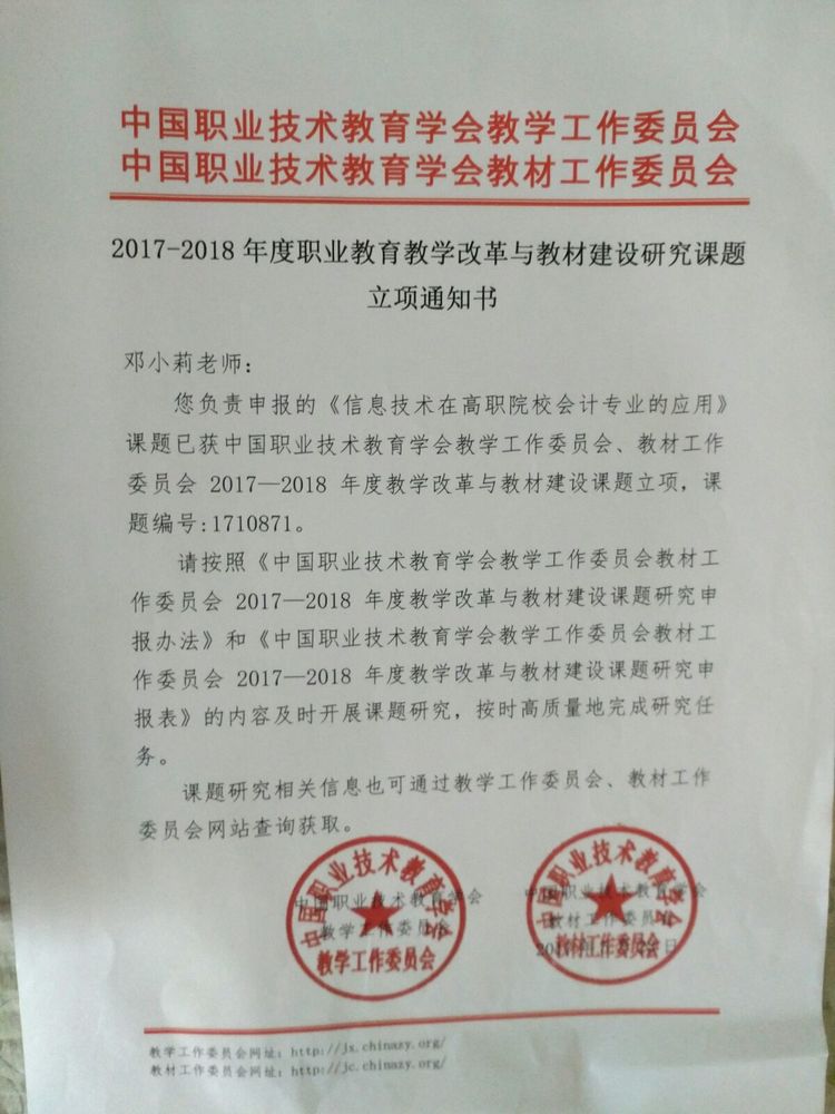 全国高职院校教学工作委员会组织的课题申报成功