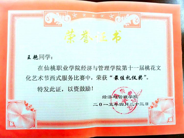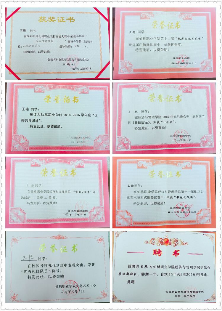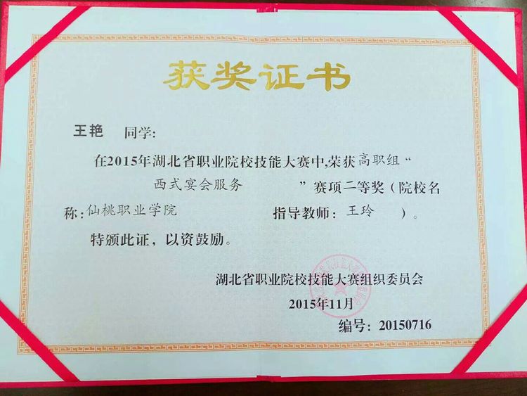 大学印象最深的,就是参加湖北省西式宴会技能比赛。主要项目有:调制鸡尾酒,煮咖啡,蛋糕装盘,西式摆台,主题英文介绍。经过两, 个多月的魔鬼式艰苦训练,每一个动作都精益求精,不仅加强了技能,更重要的是我们成长了,懂得一分耕耘一分收获,阳光总在风雨后。🐬