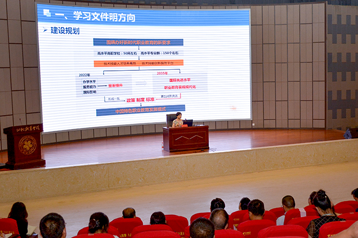 培训期间,质量管理处处长刘晓菊解读了“双高计划”的政策内涵,教育学院党总支书记王权海等6位同志作了交流发言,与会人员观看了反腐警示片《慎微》和电影《建军大业》。