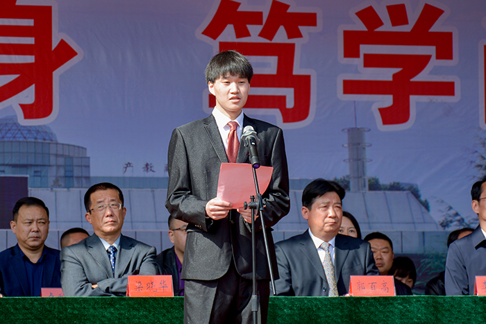 党委书记郭百高发表了热情洋溢的讲话。他代表学院全院师生员工向2020级新生表示热烈的欢迎,并围绕10个关键词勉励全体新生不负时代、不负韶华、不负青春。要不忘初心,把习近平新时代中国特色社会主义思想作为人生定位导航的航标灯塔,把个人理想追求同国家前途命运紧密联系起来,切实担负起实现国家富强、民族振兴、人民幸福的历史责任。要高情远致,自觉践行社会主义核心价值观,大力弘扬中华传统美德,认真恪守“立德正身、笃学尚能”校训,努力做一个思想纯粹、才情高雅、品行端正的人。要闻鸡起舞,始终保持“勤奋严谨、知行合一”学风,除浮躁之气,戒肤浅之风,避懒惰之习,在沉潜蓄势和厚积薄发中铺就青春成长之路。要不耻下问,虚心求教于老师,静心问道于书本,互相学习,共同进步。要知行合一,大力弘扬“先知先觉、创新创优”校风,不断涵养“精益求精、善益求善”工匠精神,努力成为知行合一、理实并进的高素质技术技能人才。要程门立雪,继承发扬尊师重教的优良传统,尊重老师的劳动,听从老师的教诲,把优异的学业成绩和事业成就作为对老师的最大回报。要守望相助,以宽容人,以仁惠人,以诚待人,以信交人,在团结互助、温暖和谐的氛围中感受青春岁月的纯真与美好。要千锤百炼,锤炼坚强意志,塑造健全人格,磨砺完美精神,以健康的体魄和阳光的心态迎接大学生活的每一天。要大爱无疆,心向大爱,爱党爱国,爱校爱家,心怀大美,以勤俭为美,以节约为荣,自觉增强责任意识和集体观念,做一个内心纯善、心有大爱的谦谦君子。要居安思危,牢固树立安全意识,严格遵守法律法规,切实保护自身生命安全,共同维护学院安全稳定和谐的良好环境。