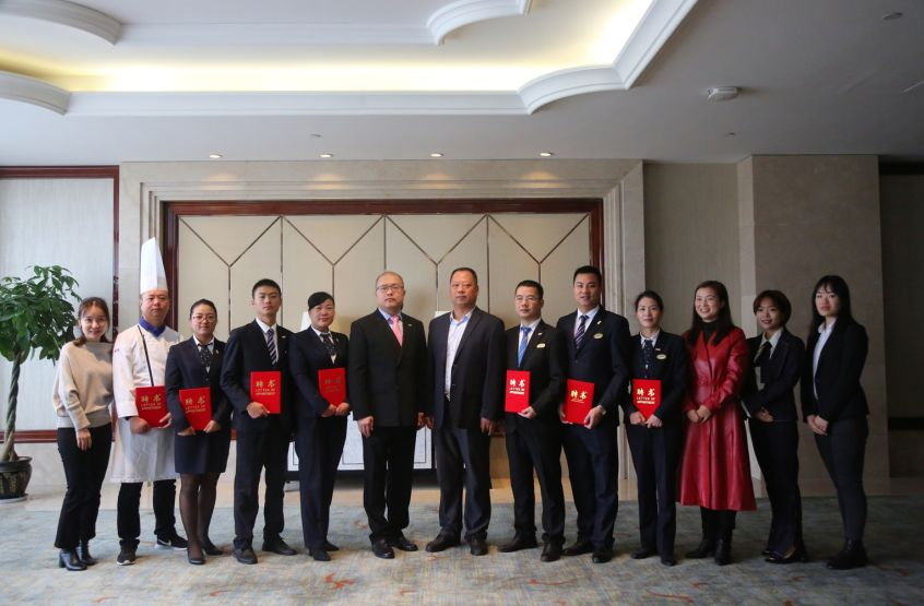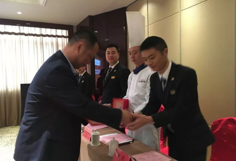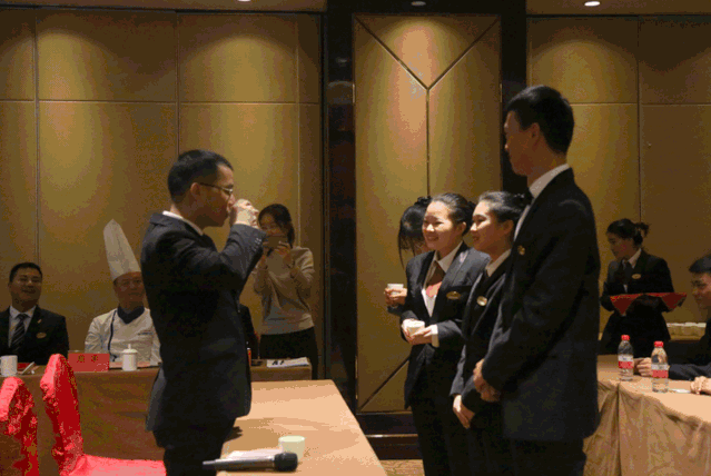 拜师环节,酒店人力资源蔡涛总监、餐饮部陆君肖总监、厨政部熊军总厨、餐饮部田凯经理、前厅部万珍梅经理、客房部曹玉芳经理、财务部刘伟荣经理分别接受了各自的爱徒敬上的拜师茶。