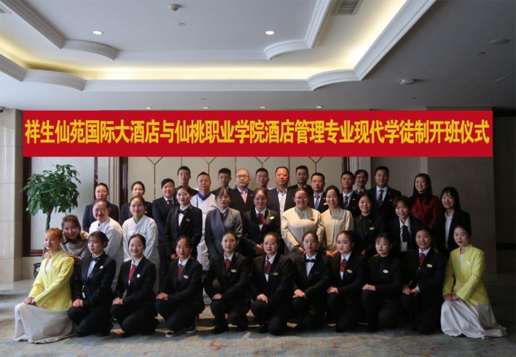 现代学徒制作为国家教育部推出的职业教育新模式,不仅是学校与企业联合培养人才的重要途径,也能够进一步完善校企合作育人机制,培养以技能为主的现代人才。2019年10月28日,酒店在桃都厅组织举办了祥生仙苑国际大酒店与仙桃职业学院经济管理学院酒店管理专业第三届现代学徒制开班暨拜师仪式。