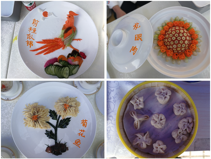 烹调工艺与营养专业是我院发展最为迅猛的专业,是校级现代学徒制专业,2018年开办至今已有三个年级,8个班212名学生。该专业主要培养学生中餐烹调、中式面点、食品雕刻、西式烹饪、营养配餐等专业技能。此次活动周展示了中式面点有荷花酥、天鹅酥、芙蓉酥、菊花酥;中餐热菜有粉蒸松鼠鱼、菊花鱼、菊花豆腐、龙眼肉;西餐菜品是寿司和披萨;冷拼雕刻作品:孔雀迎宾。在展示现场,20几名同学或现场雕刻,白萝卜、胡萝卜、红心萝卜等在同学们的手里翻飞,顷刻间就能呈现出栩栩如生的各种造型;或现场和面作面点,只见一团团面团在同学们的手中翻转变化,立刻做成了种造型的包子、糕点;或现场制作寿司,各种颜色的蔬菜配上海苔、紫菜,利用内卷、外卷两种手法,做出的寿司引来不少参观的学生前来品尝;或现场切菜秀刀工,只见平凡无奇的白萝卜、青黄瓜在同学们的刀下切出了渔网花刀和蓑衣黄瓜。